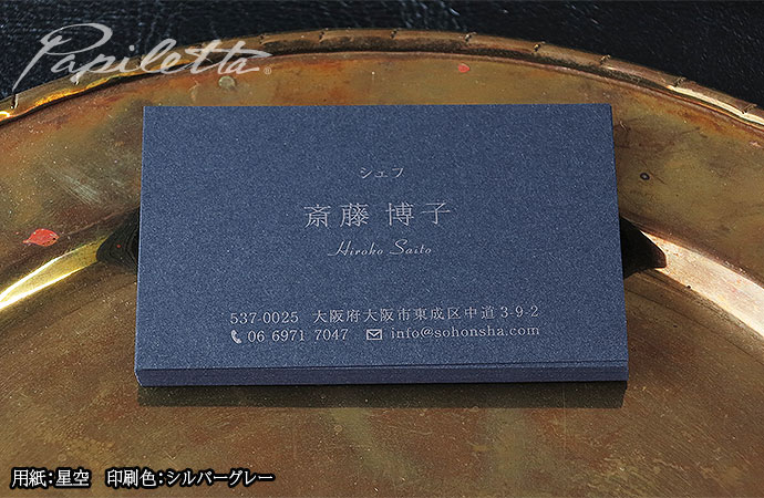 官製はがき約1枚分の厚さで、しっかりコシのあるグリッター名刺。オシャレな方、アート関連の方、紙好きさんには超オススメ。光を受けて輝く上品な濃紺ラメにクールなシルバーグレイ印刷を配した高級名刺は、大人の男性、女性に似合います。書体やデザインにこだわるプロフェッショナルを感じさせる一枚です。地図(別途お見積り:お問合せフォーム)やロゴもお入れ致しますのでショップカードとしても最適。