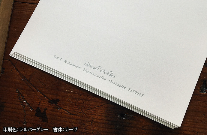 便箋と同色のゴールドブラウン色かシルバーグレイ色で、2行までお入れします。